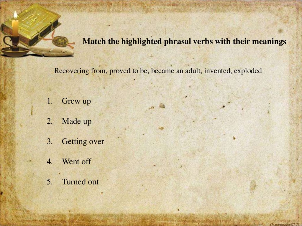 Match the highlighted phrasal verbs with their meaningsRecovering from, proved to be, became an adult, invented, exploded