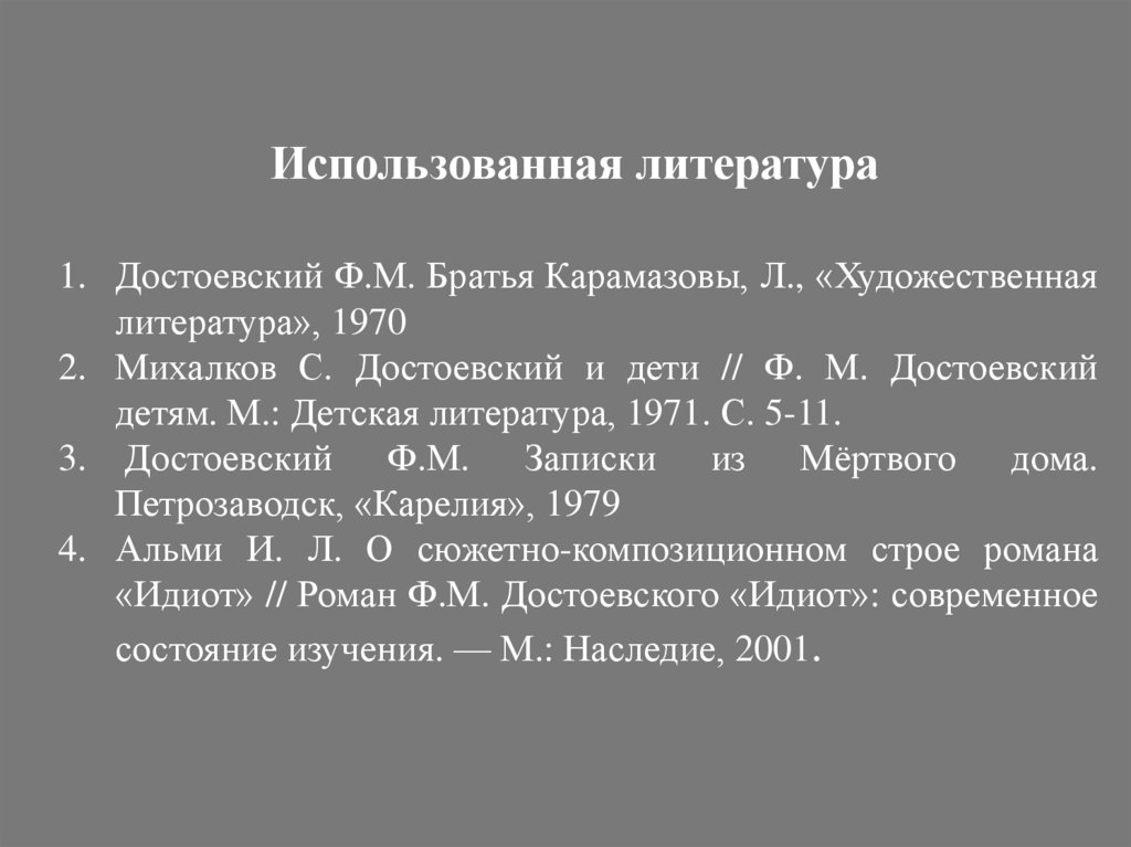 Использованная литература1. Достоевский Ф.М. Братья Карамазовы, Л., «Художественная