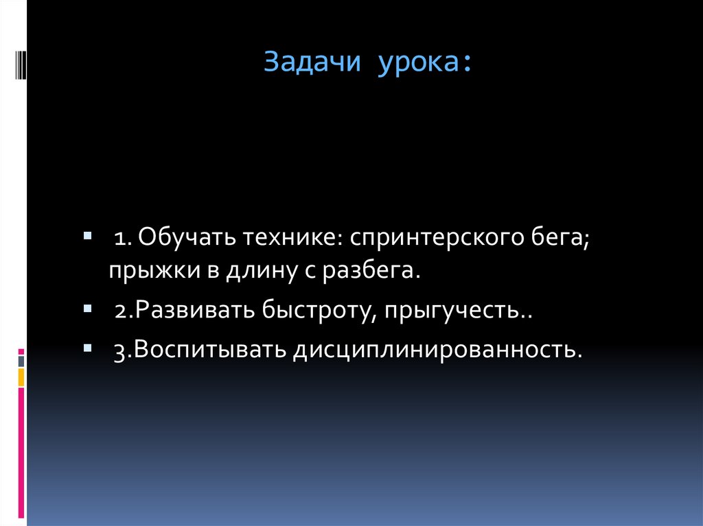 Задачи урока:1. Обучать технике: спринтерского бега;