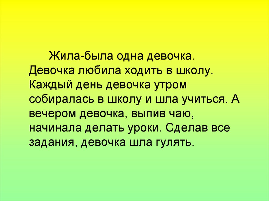 Жила-была одна девочка.Девочка любила ходить в школу.