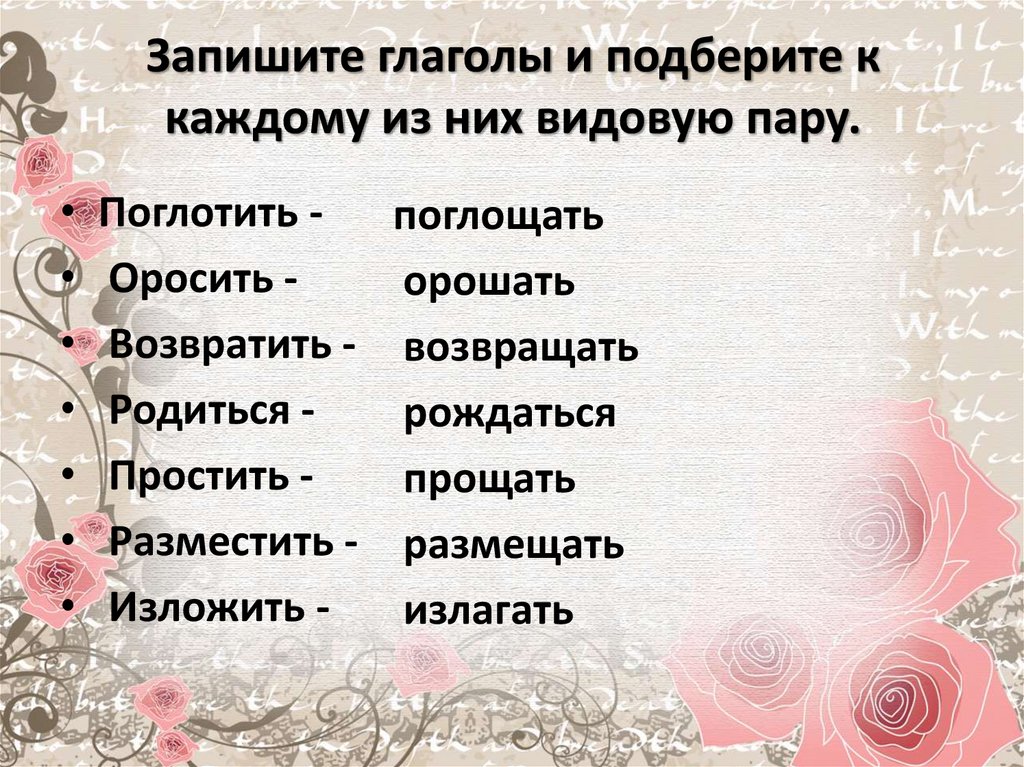 Поглотить Оросить Возвратить Родиться Простить Разместить Изложить -