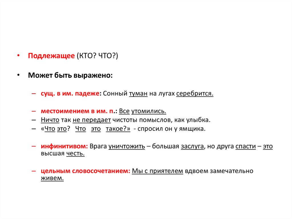 • Подлежащее (КТО? ЧТО?)• Может быть выражено: