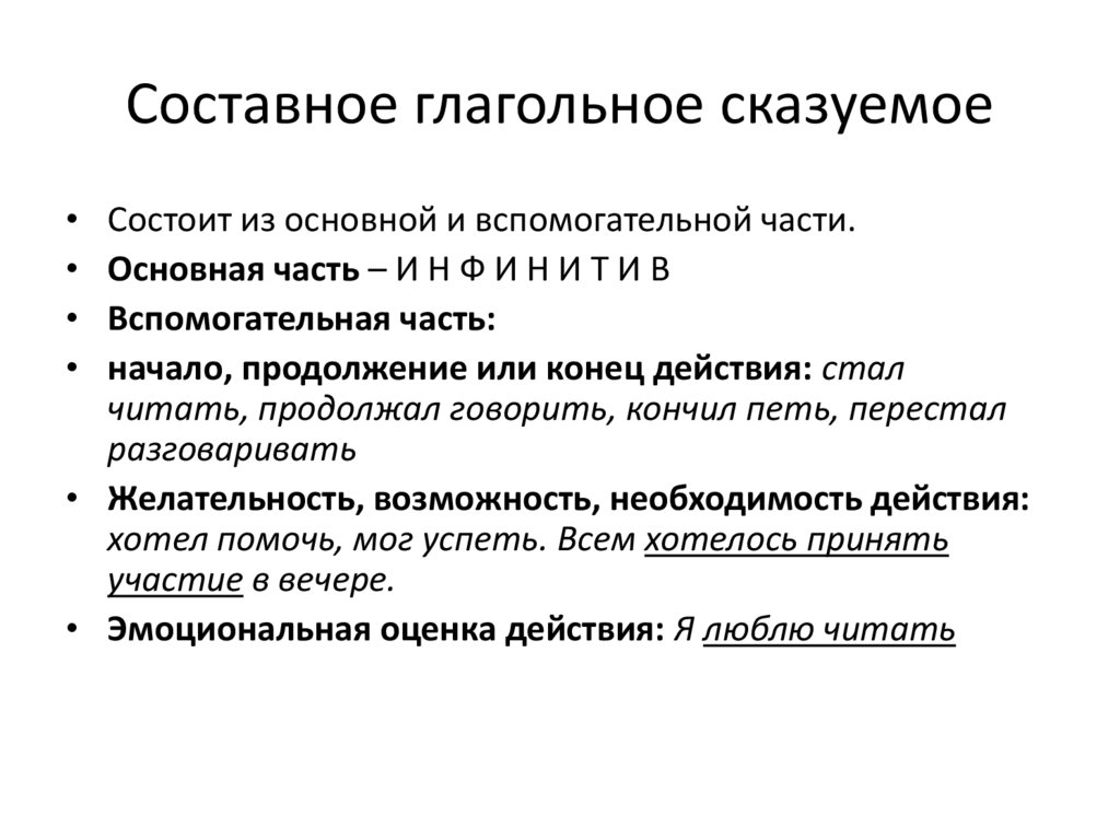 Составное глагольное сказуемоеСостоит из основной и вспомогательной части.