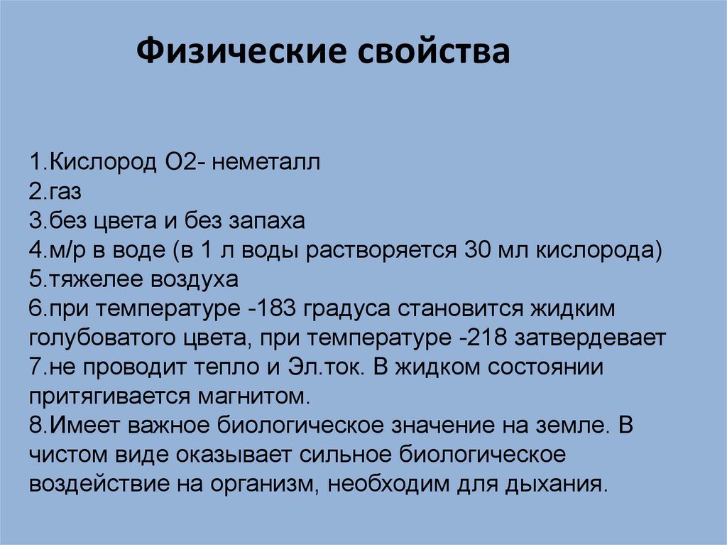 Физические свойства1.Кислород О2- неметалл