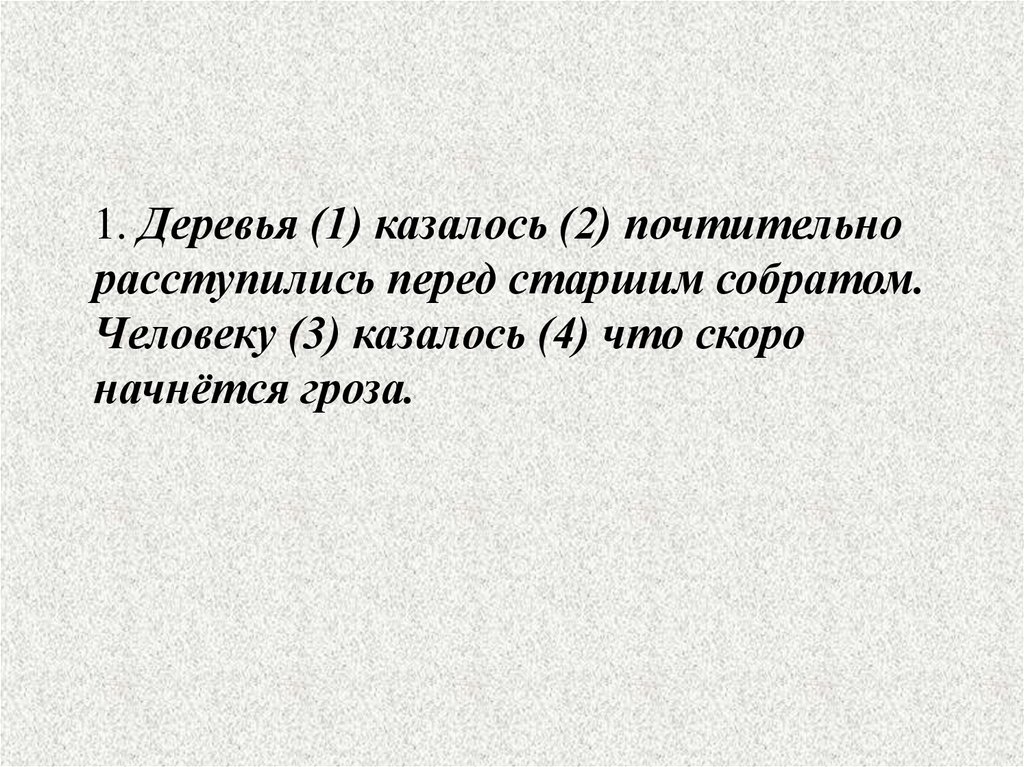 1. Деревья (1) казалось (2) почтительнорасступились перед старшим собратом.