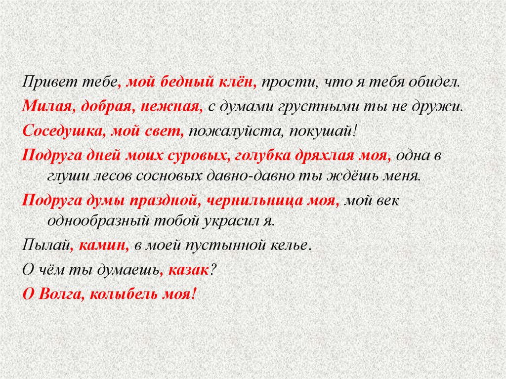 Привет тебе, мой бедный клён, прости, что я тебя обидел.Милая, добрая, нежная, с думами грустными ты не дружи.