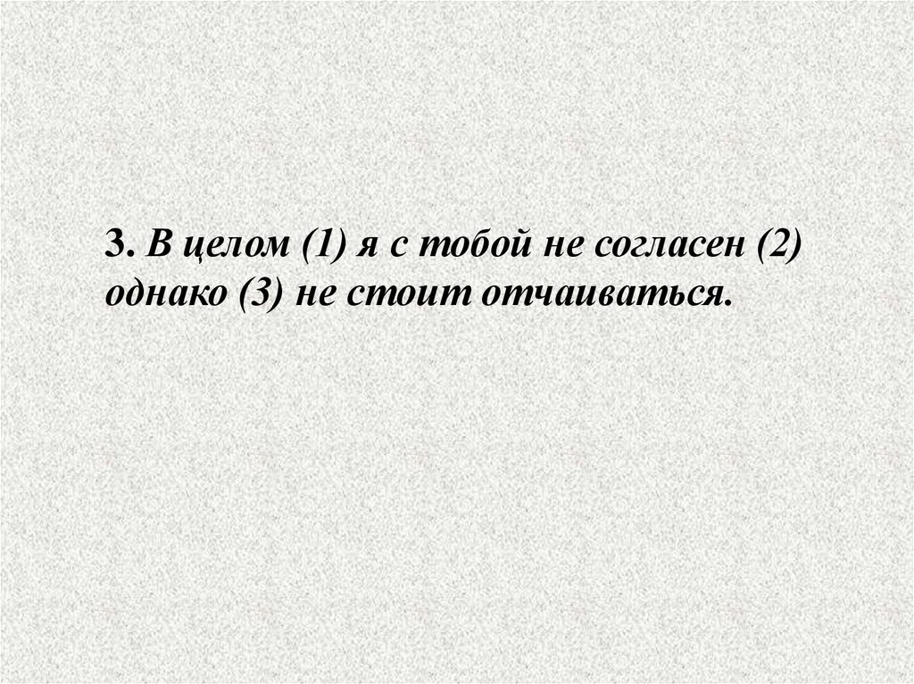 3. В целом (1) я с тобой не согласен (2)однако (3) не стоит отчаиваться.