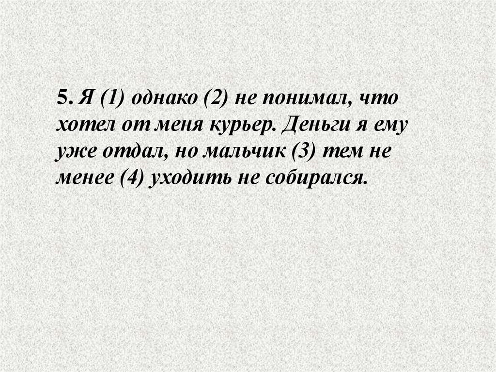 5. Я (1) однако (2) не понимал, чтохотел от меня курьер. Деньги я ему