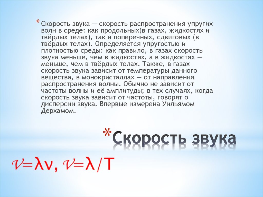 * Скорость звука — скорость распространения упругихволн в среде: как продольных(в газах, жидкостях и