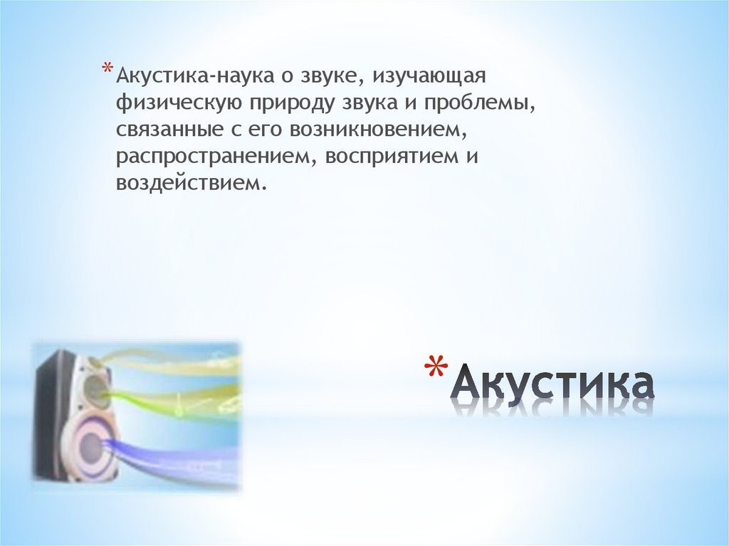 * Акустика-наука о звуке, изучающаяфизическую природу звука и проблемы,
