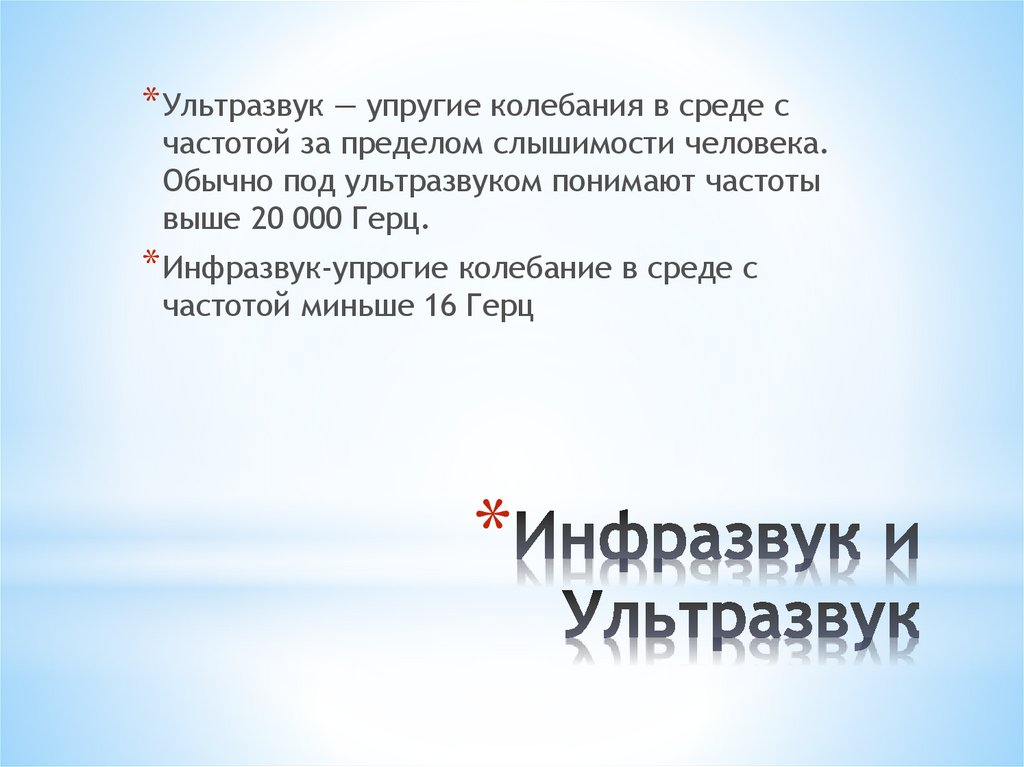 * Ультразвук — упругие колебания в среде счастотой за пределом слышимости человека.