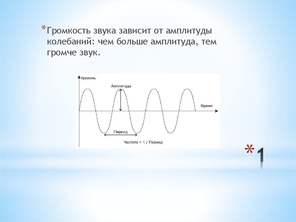 * Громкость звука зависит от амплитудыколебаний: чем больше амплитуда, тем