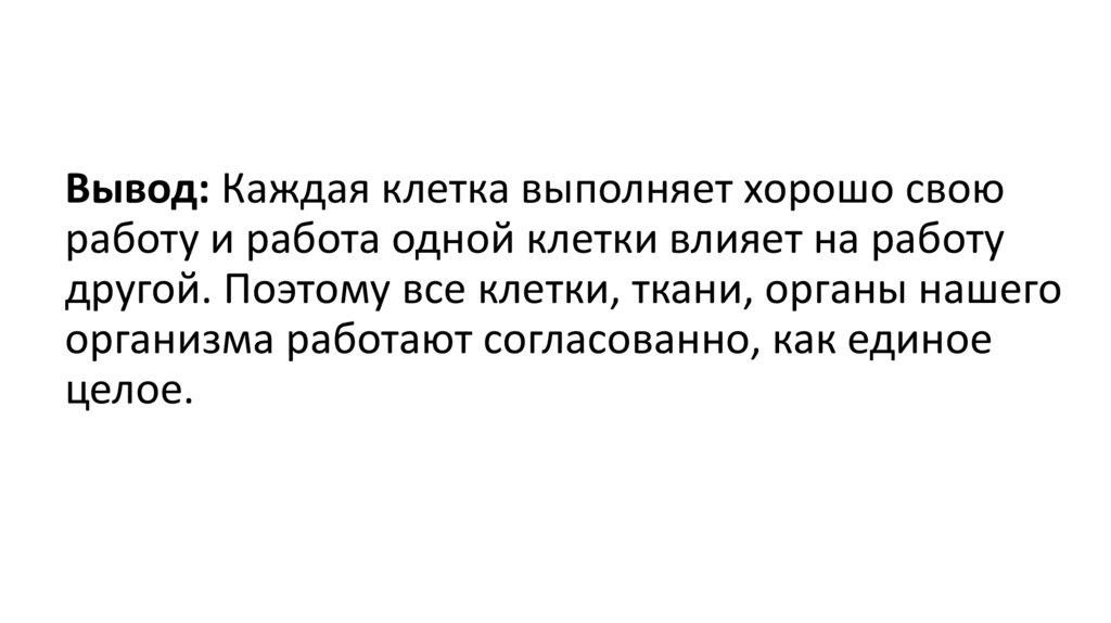 Вывод: Каждая клетка выполняет хорошо своюработу и работа одной клетки влияет на работу