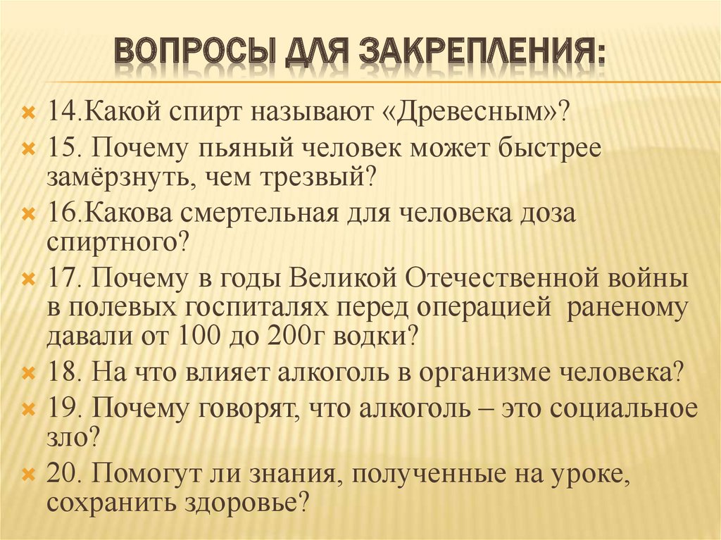 ВОПРОСЫ ДЛЯ ЗАКРЕПЛЕНИЯ:14.Какой спирт называют «Древесным»?