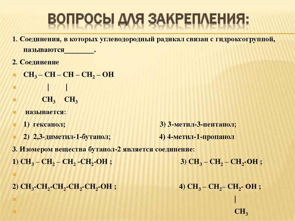 ВОПРОСЫ ДЛЯ ЗАКРЕПЛЕНИЯ:1. Соединения, в которых углеводородный радикал связан с гидроксогруппой,