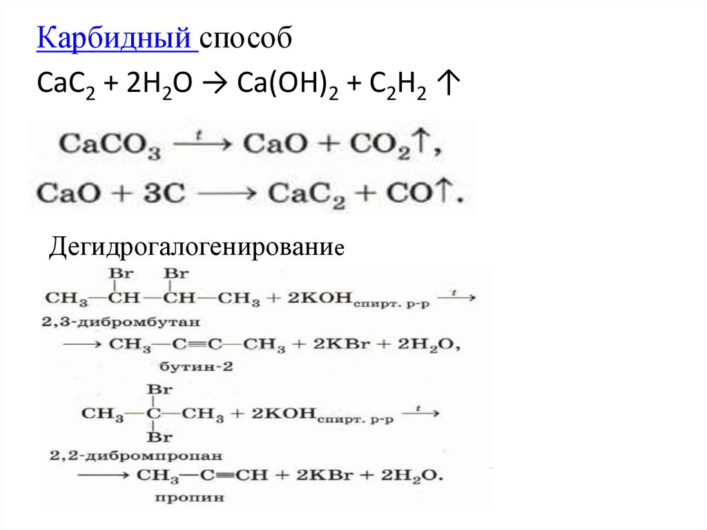 Карбидный способСаС2 + 2Н2O → Са(ОН)2 + C2H2 ↑