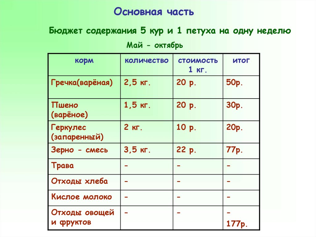 Основная частьБюджет содержания 5 кур и 1 петуха на одну неделю