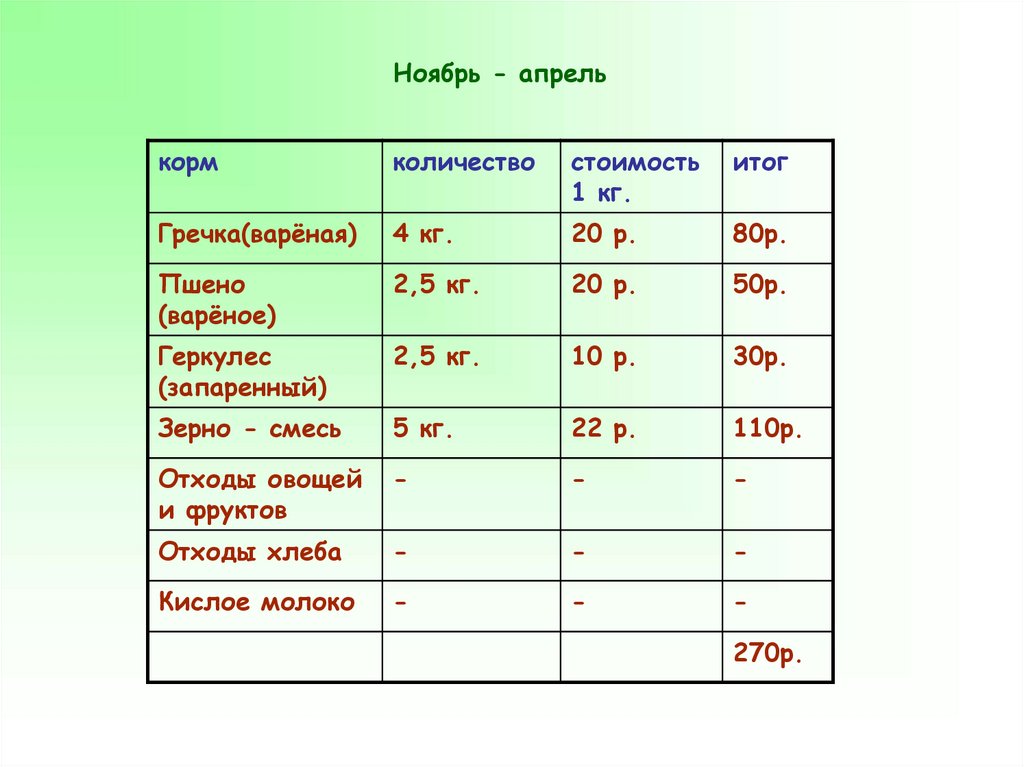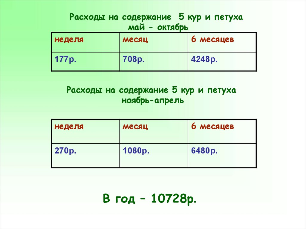 просчитать месячный бюджет* содержания пятикур и одного петуха, с учётом кормления кур