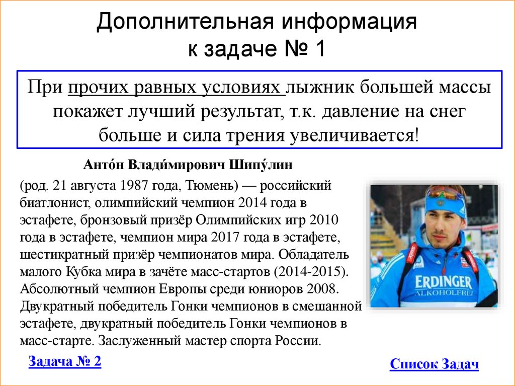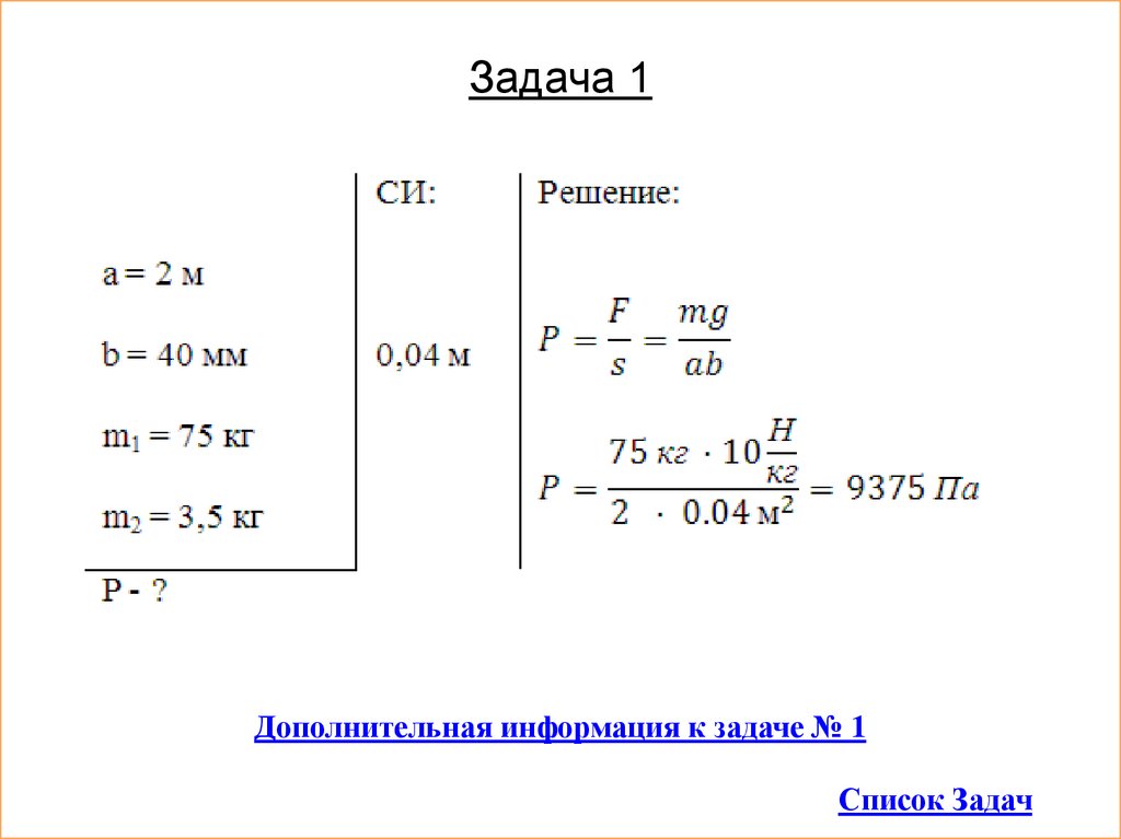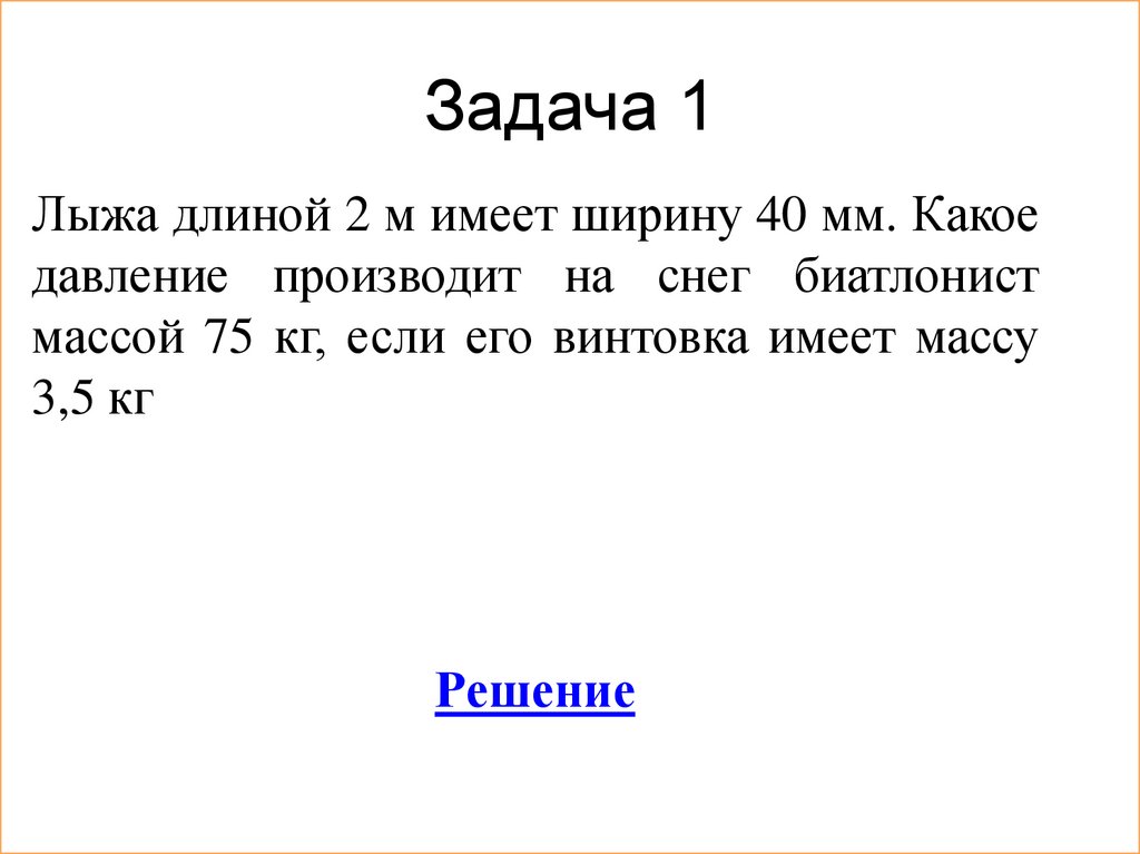 Задача 1Лыжа длиной 2 м имеет ширину 40 мм. Какое