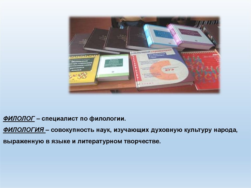 ФИЛОЛОГ – специалист по филологии.ФИЛОЛОГИЯ – совокупность наук, изучающих духовную культуру народа,