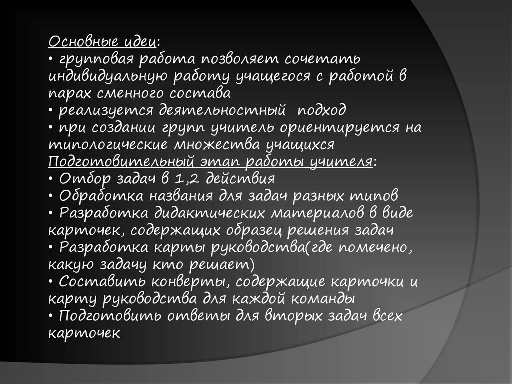 Основные идеи:• групповая работа позволяет сочетать