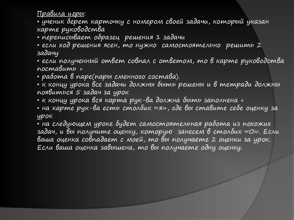 Правила игры:• ученик берет карточку с номером своей задачи, который указан