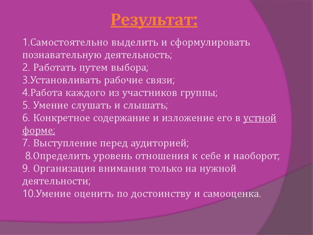 Результат:1.Самостоятельно выделить и сформулировать