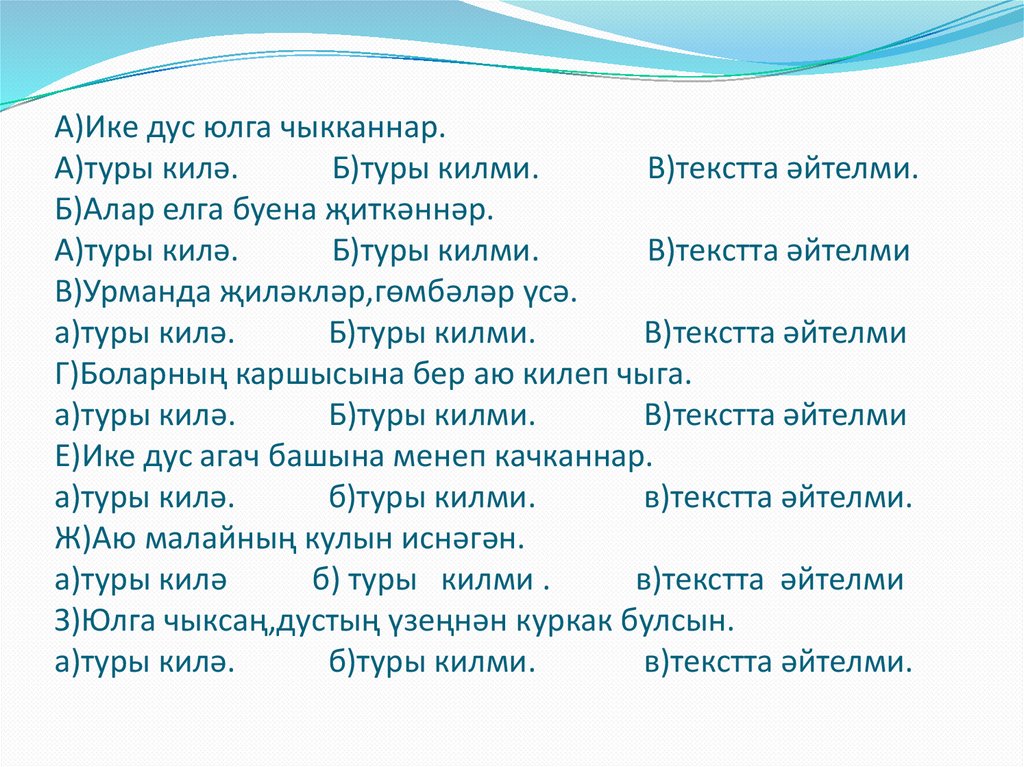 А)Ике дус юлга чыкканнар.А)туры килә.