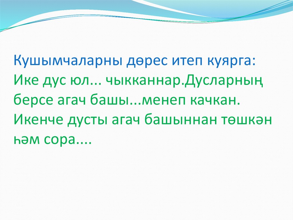 Кушымчаларны дөрес итеп куярга:Ике дус юл... чыкканнар.Дусларның