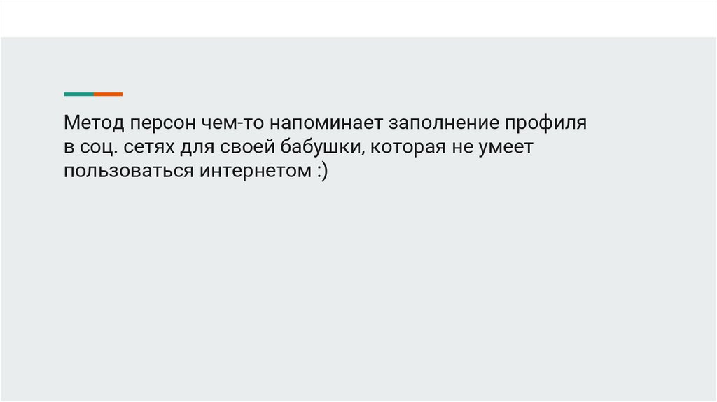 Метод персон чем-то напоминает заполнение профиляв соц. сетях для своей бабушки, которая не умеет