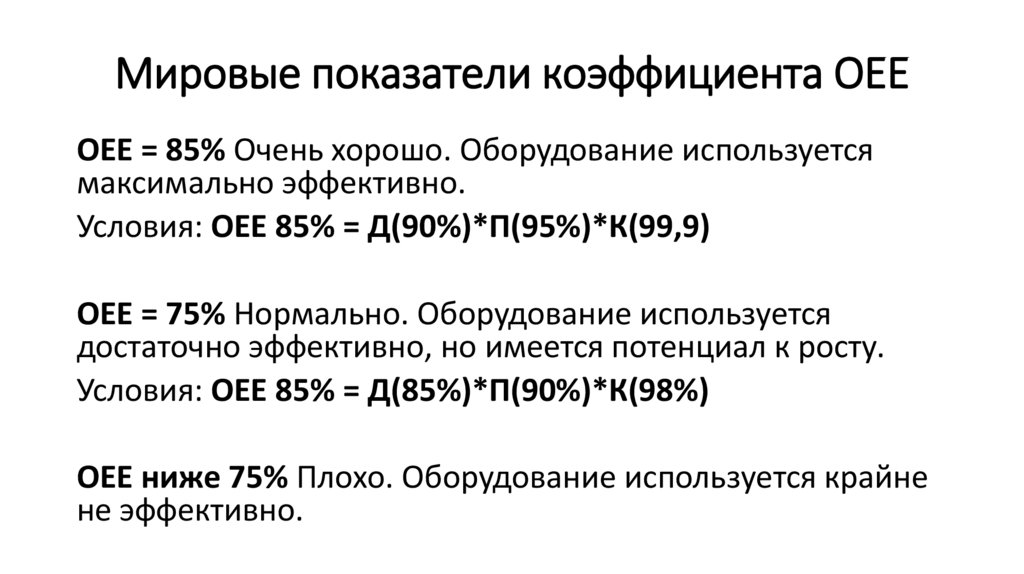 Мировые показатели коэффициента OEEOEE = 85% Очень хорошо. Оборудование используется
