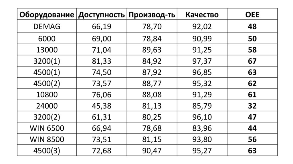 Условия: OEE 85% = Д(90%)*П(95%)*К(99,9)