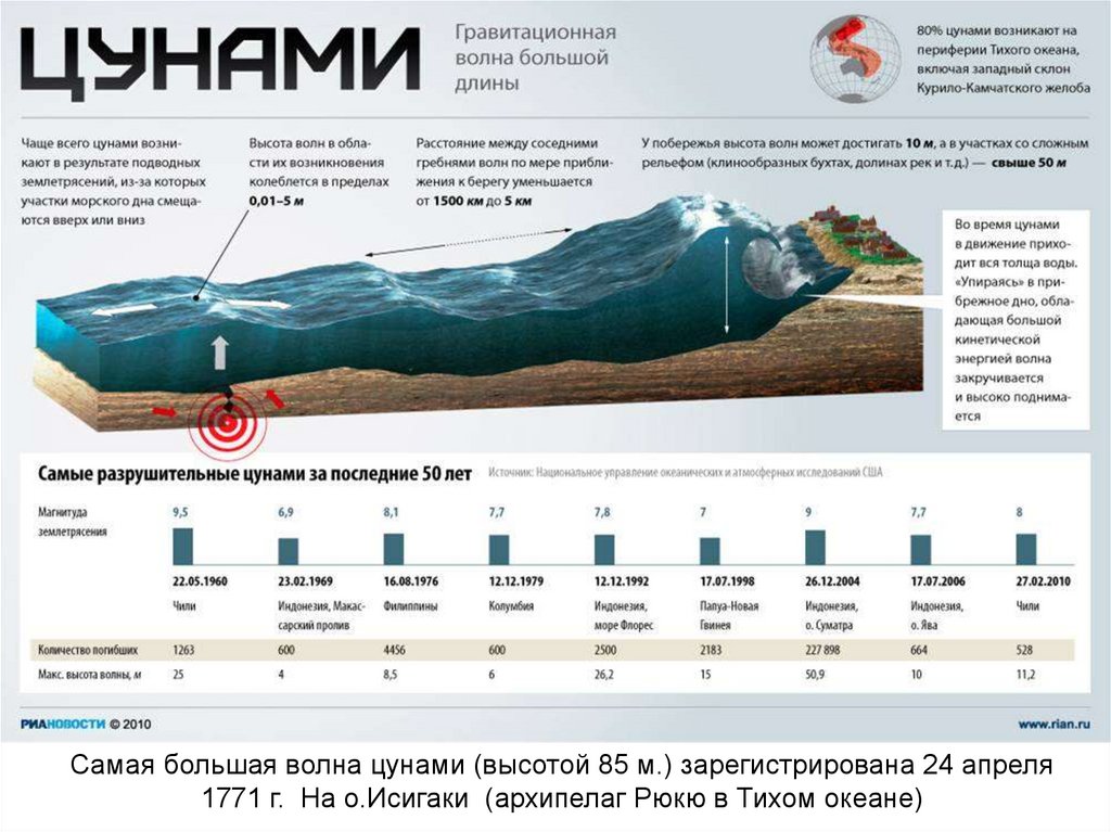 Самая большая волна цунами (высотой 85 м.) зарегистрирована 24 апреля1771 г. На о.Исигаки (архипелаг Рюкю в Тихом океане)