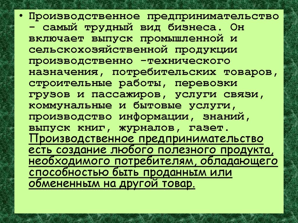 • Производственное предпринимательство- самый трудный вид бизнеса. Он