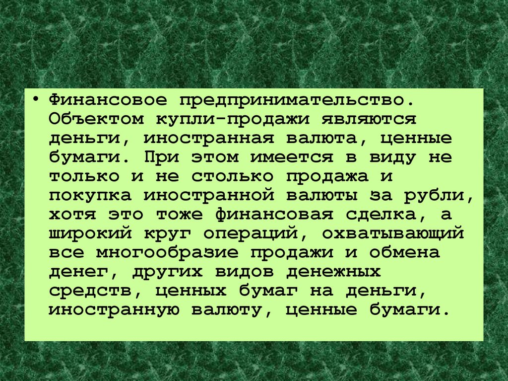 • Финансовое предпринимательство.Объектом купли-продажи являются