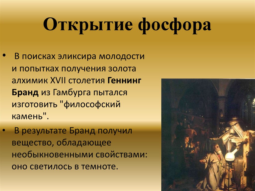 Открытие фосфора• В поисках эликсира молодости