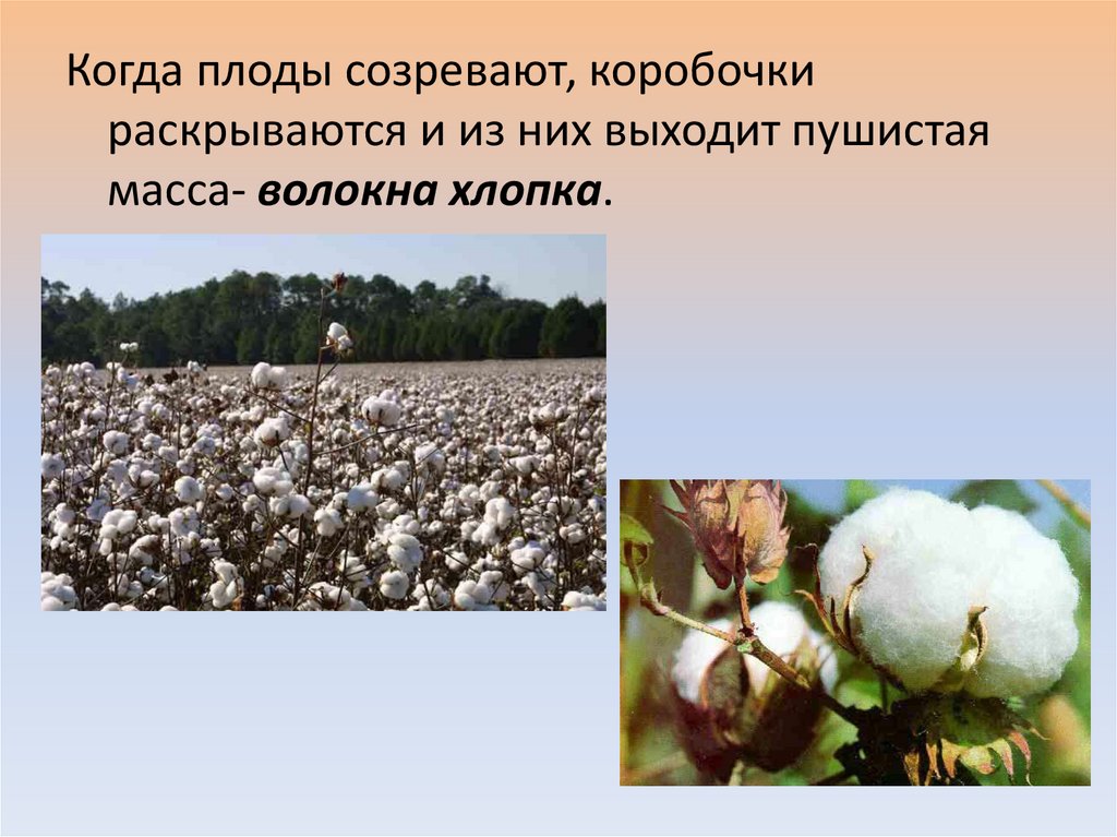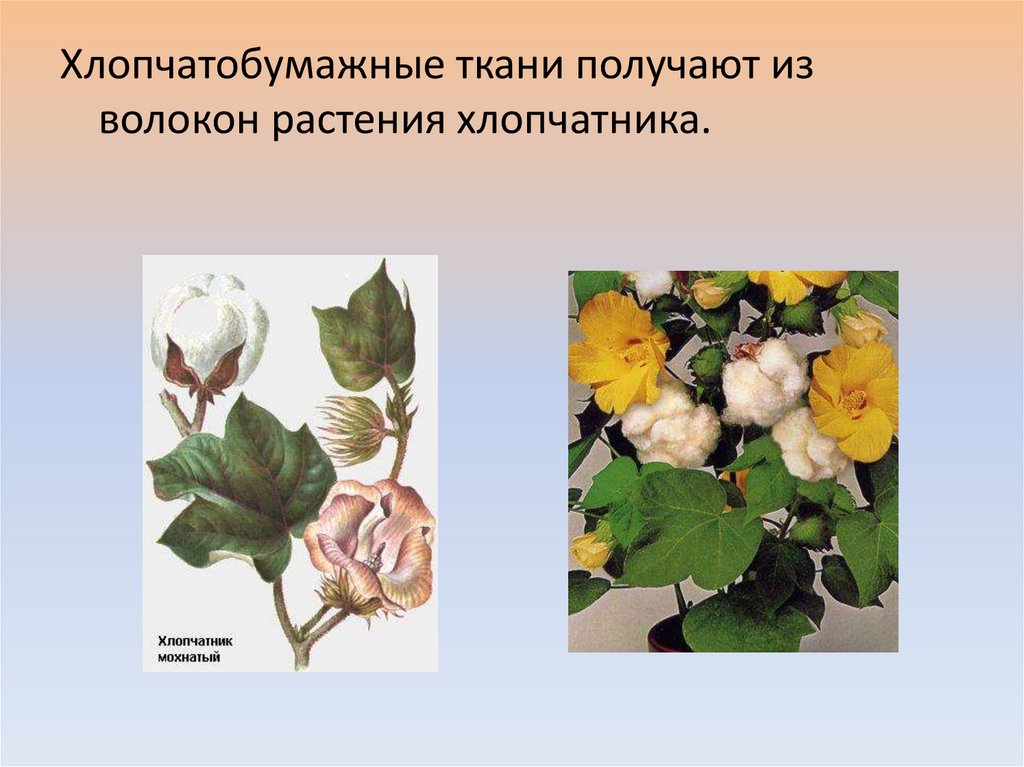Хлопчатобумажные ткани получают изволокон растения хлопчатника.