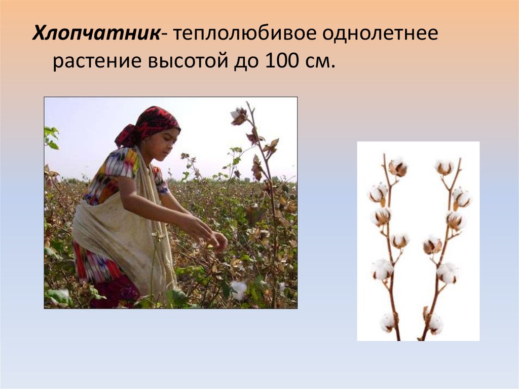 Хлопчатник- теплолюбивое однолетнеерастение высотой до 100 см.