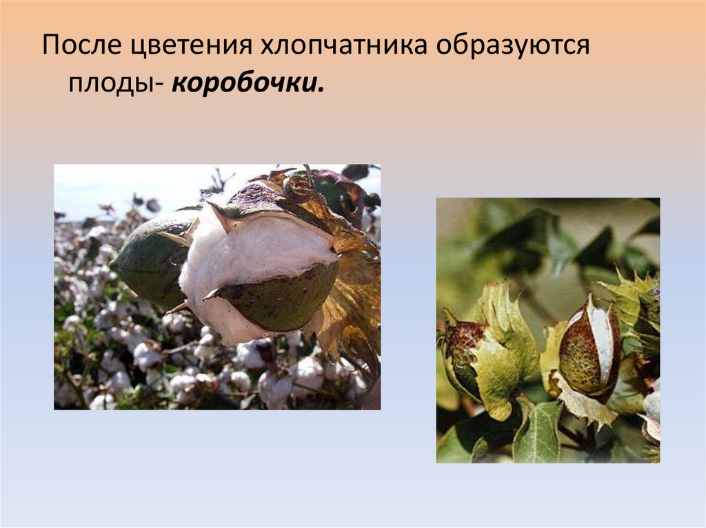После цветения хлопчатника образуютсяплоды- коробочки.
