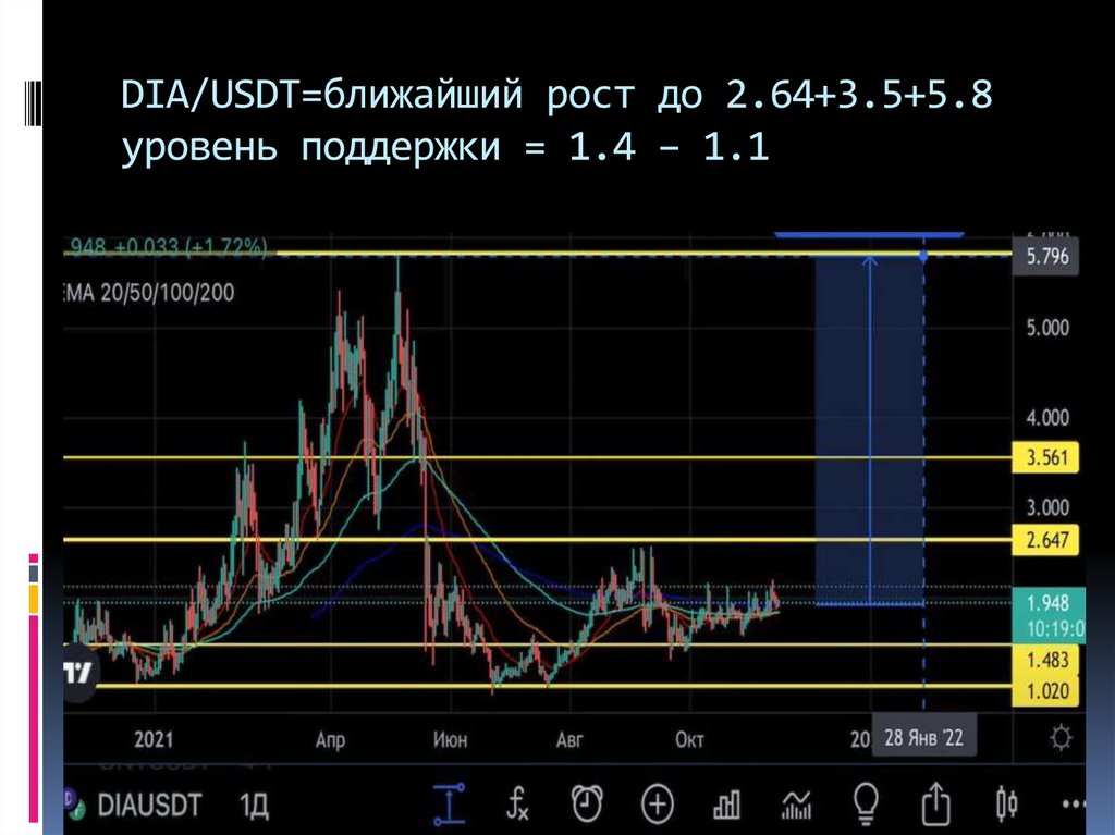 DIA/USDT=ближайший рост до 2.64+3.5+5.8уровень поддержки = 1.4 – 1.1