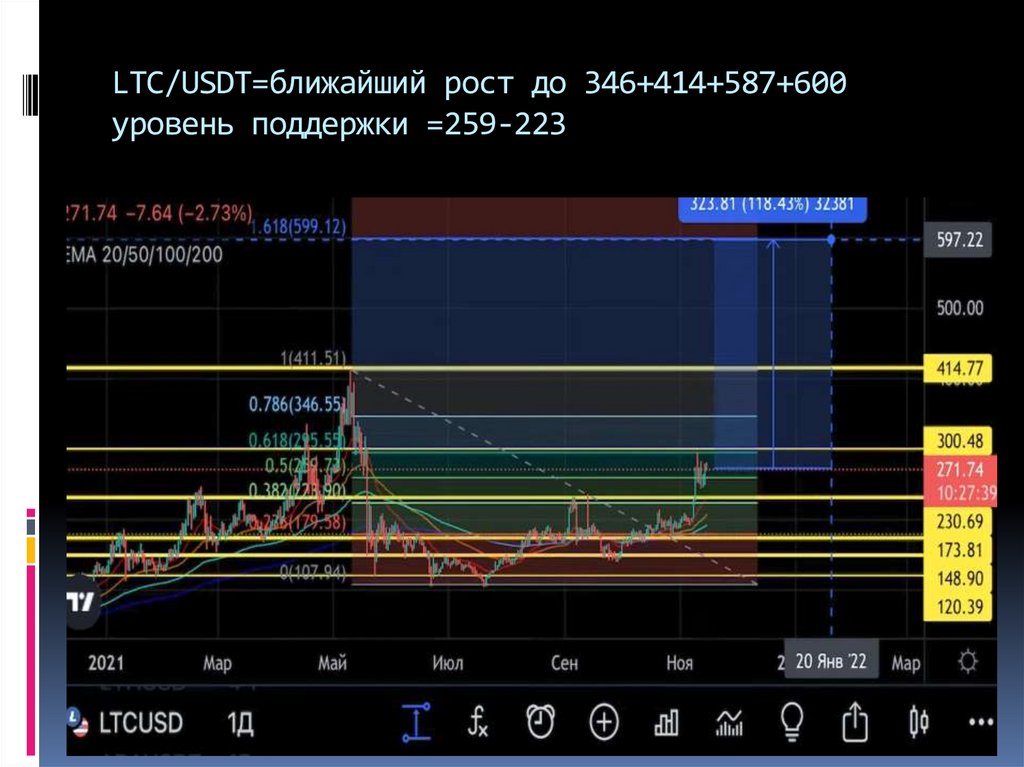 LTC/USDT=ближайший рост до 346+414+587+600уровень поддержки =259-223