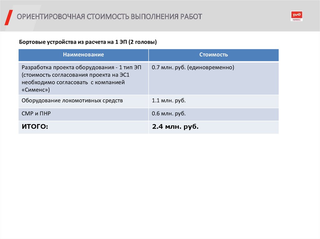 ОРИЕНТИРОВОЧНАЯ СТОИМОСТЬ ВЫПОЛНЕНИЯ РАБОТБортовые устройства из расчета на 1 ЭП (2 головы)