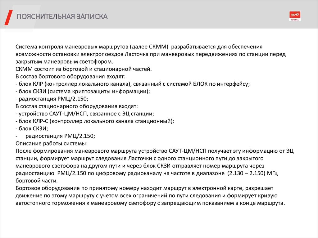 ПОЯСНИТЕЛЬНАЯ ЗАПИСКАСистема контроля маневровых маршрутов (далее СКММ) разрабатывается для обеспечения