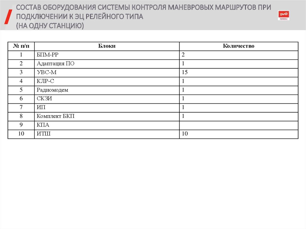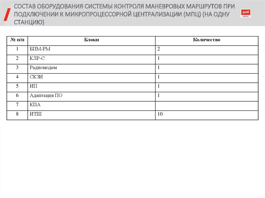 СОСТАВ ОБОРУДОВАНИЯ СИСТЕМЫ КОНТРОЛЯ МАНЕВРОВЫХ МАРШРУТОВ ПРИПОДКЛЮЧЕНИИ К МИКРОПРОЦЕССОРНОЙ ЦЕНТРАЛИЗАЦИИ (МПЦ) (НА ОДНУ