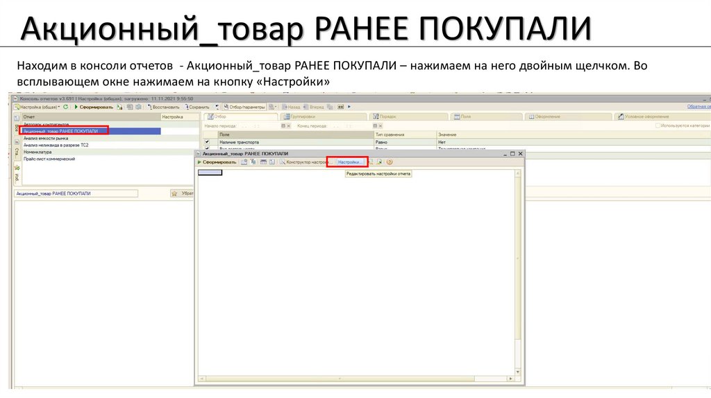 Акционный_товар РАНЕЕ ПОКУПАЛИНаходим в консоли отчетов - Акционный_товар РАНЕЕ ПОКУПАЛИ – нажимаем на него двойным щелчком. Во