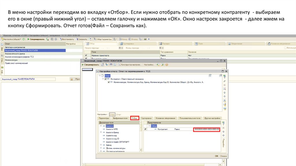 В меню настройки переходим во вкладку «Отбор». Если нужно отобрать по конкретному контрагенту - выбираемего в окне (правый нижний угол) – оставляем галочку и нажимаем «ОК». Окно настроек закроется - далее жмем на
