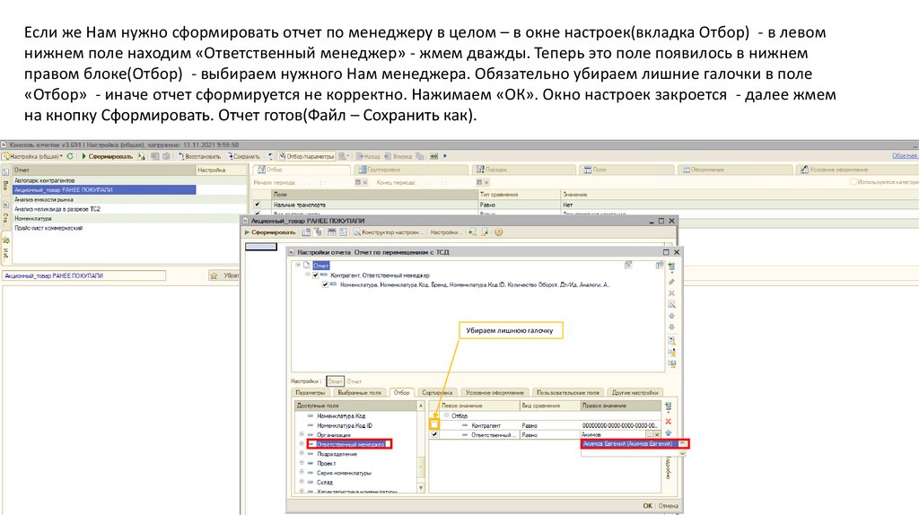 правом блоке(Отбор) - выбираем нужного Нам менеджера. Обязательно убираем лишние галочки в поле