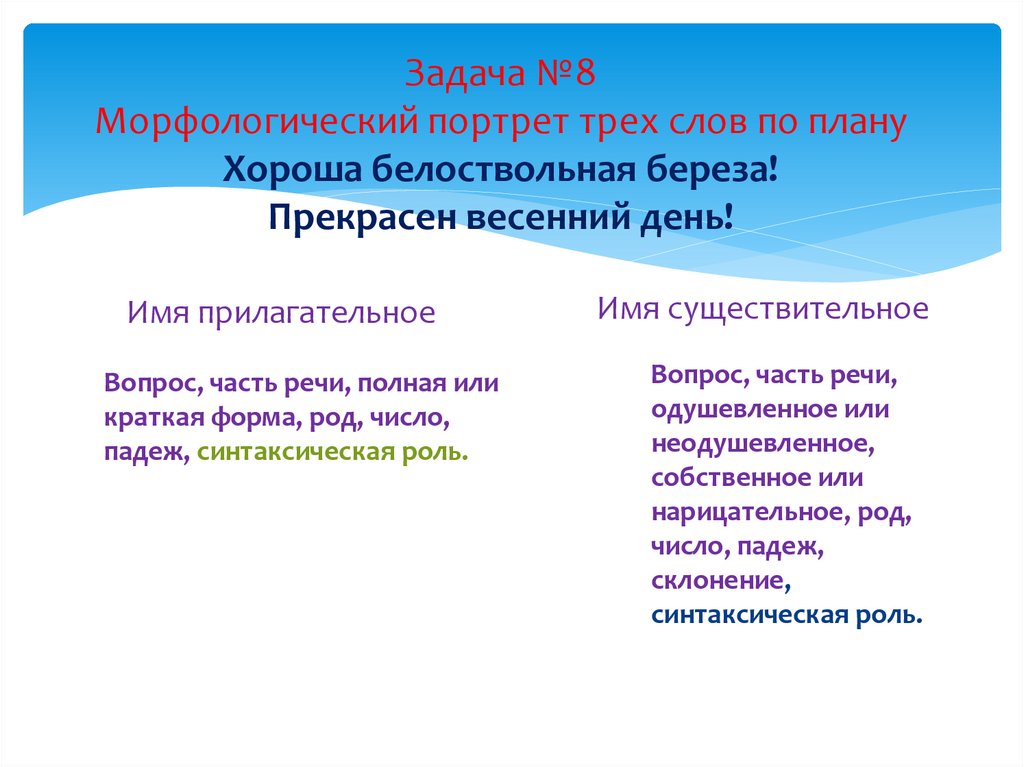 Задача №8Морфологический портрет трех слов по плану