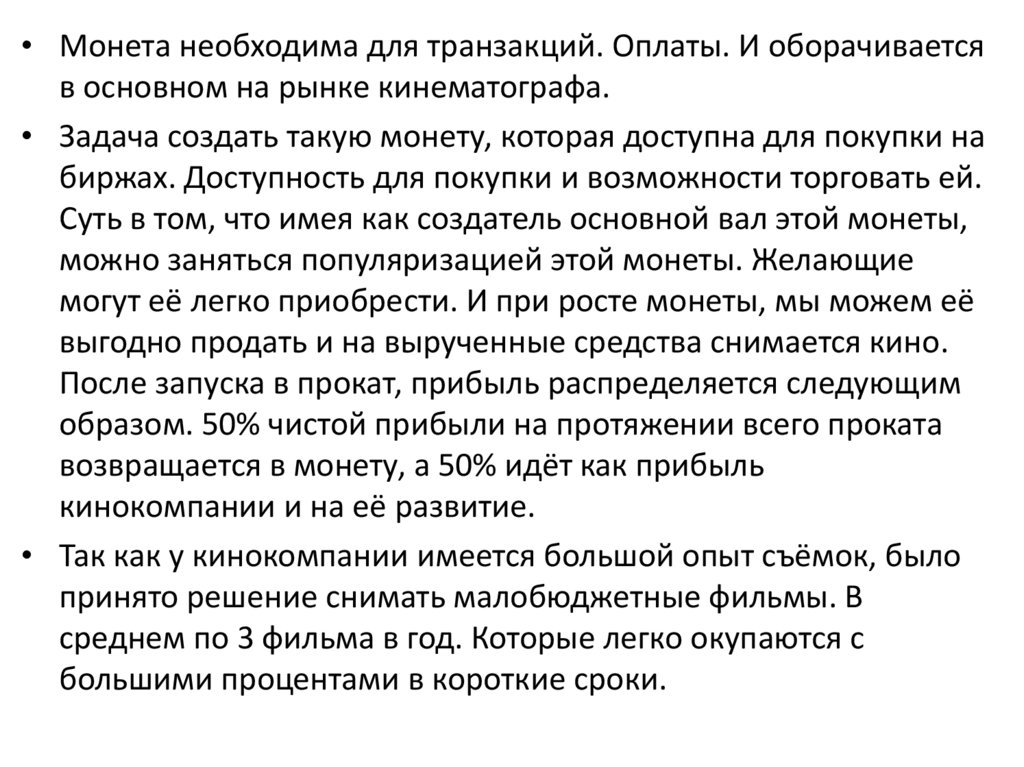 • Монета необходима для транзакций. Оплаты. И оборачиваетсяв основном на рынке кинематографа.