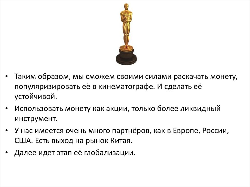 • Таким образом, мы сможем своими силами раскачать монету,популяризировать её в кинематографе. И сделать её